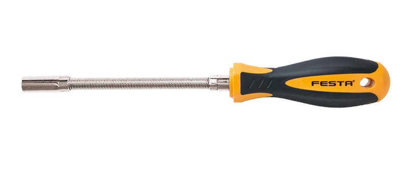 nástrčný šroubovák 7 mm - na hadicové spony spirálový pružný dřík z velmi kvalitní chromvanadiové oceli, povrchově chráněný tvrdochromem ergonomická dvoukomponentní rukojeť - kombinace polypropylenu a TPE gumy zaručuje výborné antiskluzové vlastnosti a odolnost vůči mazadlům a chemikáliím