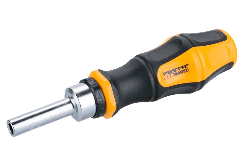 Ráčnový šroubovák s držákem bitů 1/4, CrV, ergonomická dvoukomponentní měkčená rukojeť, otvor pro páku, magnetická koncovka.