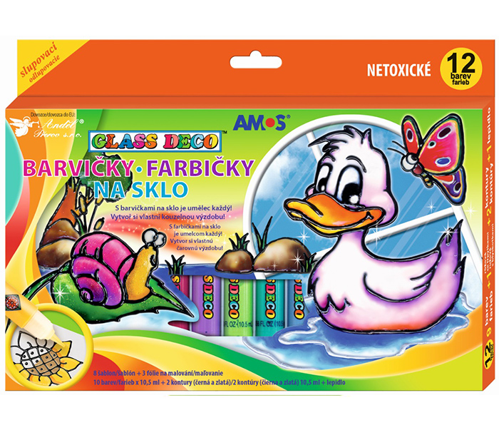 - slupovací barvy na sklo- lze přenést na sklo, zrcadlo nebo jiný hladký podklad- barvy zanechávají skrvny na oblečení- sada 12 barev, 8 šablonek, 3 fólie, lepidlo k uchycení fólie k předloze- objem tuby 10,5ml
