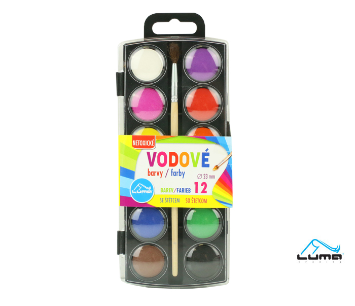 - kvalitní vodové barvy- v plastové paletě s víčkem- štětec součástí balení- 12 barev- průměr barvy 23mm
