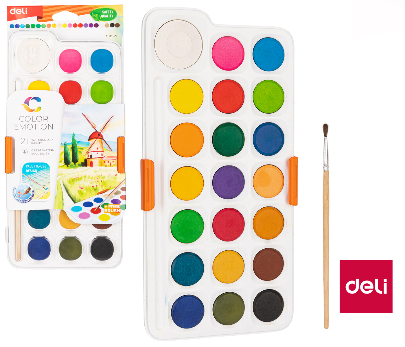 - kvalitní vodové barvy - víko jako malířská paleta - štětec součástí balení - 21 barev - průměr barvy 28mm- průměr bílé 40mm