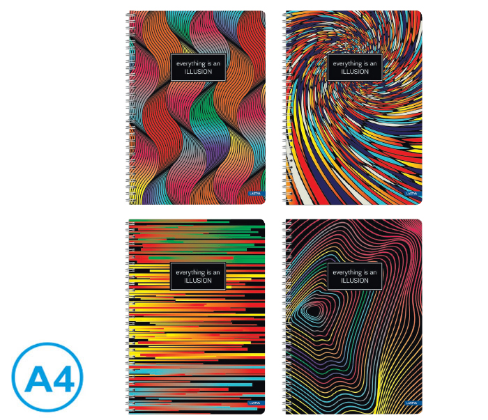 - vrchní desky potištěné a potažené laminem- zaoblené rohy- první stránka barevná- spirála na delší straně- formát: A4- počet listů: 100- gramáž: 70 g- vzor: linka- mix motivů