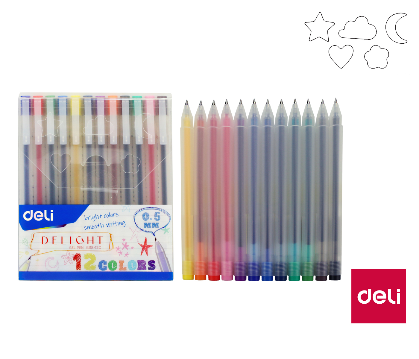 - barevná gelová pera v sadě- hladné psaní- jasné barvy- šířka stopy 0,5 mm- 12 barev