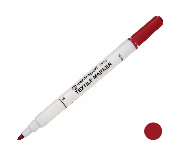 - speciální značkovač s ergonomicky tvarovaným úchopem- vhodný na většinu druhů textilu a kůži- pigmentový inkoust na vodní bázi- zdravotně nezávadný- světlostálý- nevypratelný- prát do 60 °C- skladovat ve vodorovné poloze- ventilační chránítko, po použití uzavřít- barva červená- šířka stopy 1,8mm- válcový hrot