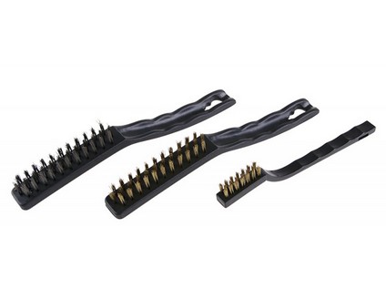 Kartáč drátěný sada 3díl. (1 x ocel, 2 x mosaz).Sada tří kusů ručních kartáčů - plastový základ, 1 x ocelový drát a 2 x mosazný drát. použití: - ocelový - vhodný pro hůře přístupná místa a jemné začišťovací a brousící práce, na kov (nedoporučuje se na nerez), dřevo, odstranění rzi, barvy…. - mosazný - vhodný pro opracování měkkých kovů a tam, kde je třeba zamezit možnosti jiskření, jemné brousící práce, vhodné i na nerez