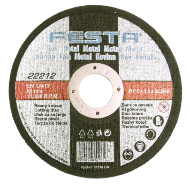 Druh Zrna: Korund Pojivo: Syntetické pryskyřice na bázi aldehydu Provedení: rovný Max. Pracovní rychlost: 80m/s Max. přípustné otáčky: 10200 1/min Pro zvýšení pevnosti armován dvouvrstvou sklotextilní vložkou. Použití na kov, litinu, NEREZ.