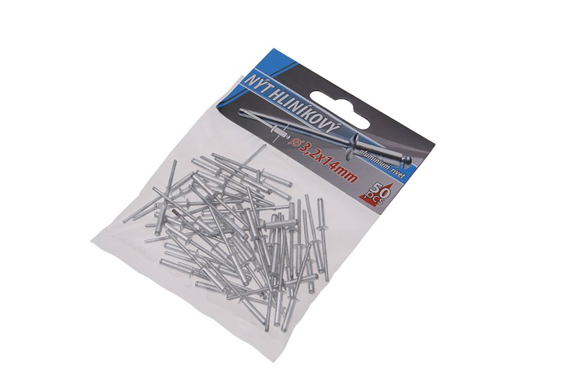 Klasické trhací slepé aluminiové nýty průměr 3,2 mm délka 14 mm v malém balení 50 kusů, vhodné pro malospotřebitele. Instruktážní video Instruktážní video