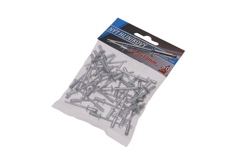 Klasické trhací slepé aluminiové nýty průměr 4,8 mm délka 10 mm v malém balení 50 kusů, vhodné pro malospotřebitele. Instruktážní video Instruktážní video