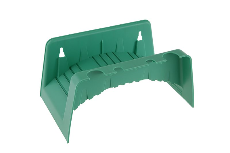 Držák zahradní hadice, možnost upevnění na stěnu, odkládací prostory na koncovky, stříkací pistole a jiné.