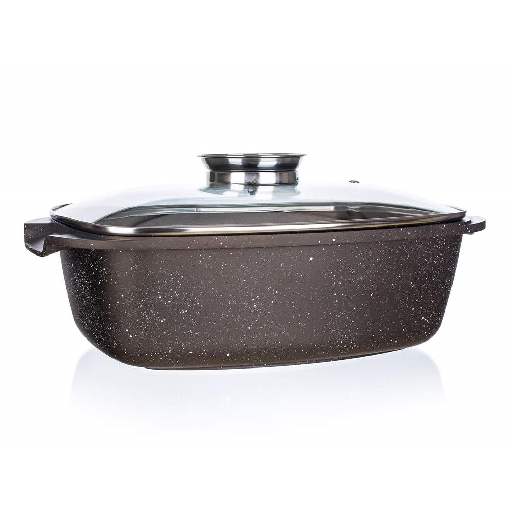 Hliníkový litý pekáč se skleněnou termo poklicí a aroma knobem PREMIUM DARK BROWN s nepřílnavým povrchem, rozměr 32 x 20 x 11 cm, hnědý granitový dekor, tloušťka stěny 2,2 mm, plně indukční dno. Nepřilnavý povrch je velmi tvrdý a odolný proti poškrábání. Hrnec je odolný proti nárazu a deformaci tvaru.
