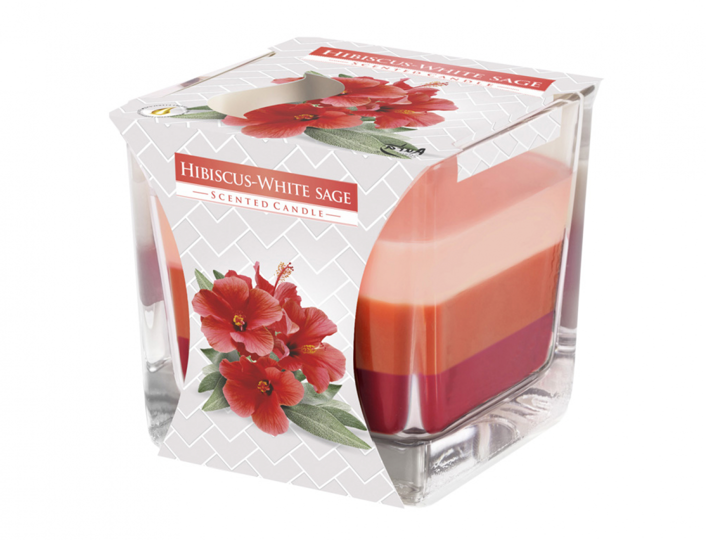 Vonná svíčka v silnostěnném skle. Voní po ibišku a bílé šalvěji. Minimalistický skleněný obal je čtvercového půdorysu a ocení ho zejména ti, kteří preferují funkčnost a moderní design. Svíčka má 3 vrstvy různobarevného vosku a 2 knoty, pro intenzivní plamen. Má certifikát kvality RAL, který garantuje bezpečnost a kvalitu použitých materiálů. Balení: 1ks v papírovém přebalu. Doba hoření: 32 hod. Rozměry: 8 x 8 x 8 cm. Hmotnost náplně: 170 g. Barva: oranžová - červená.