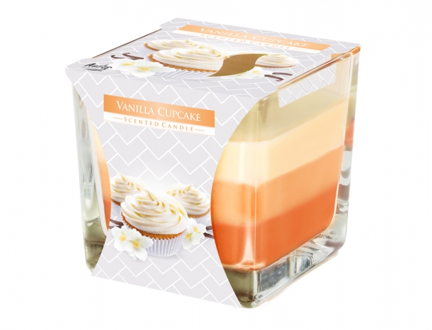 Vonná svíčka v silnostěnném skle se 3 barvami vosku. Voní po vanilkovém cupcaku: krémové vanilce, ořechu a kokosu. Hoří: 32 hodin. Šířka: 8 cm, výška: 8 cm. Hmotnost náplně: 170 g.