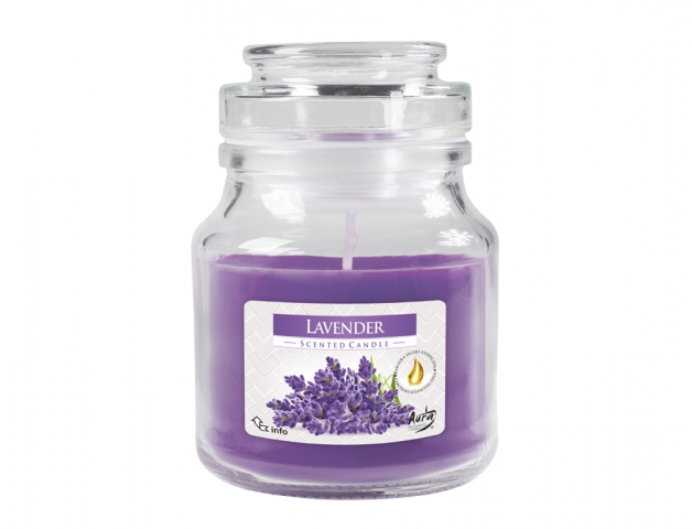 Fialová svíčka ve skleněné nádobce se skleněným víčkem. Vůně: levandule. Doba hoření: 28 hodin. Šířka: 7 cm, výška: 10 cm. Hmotnost náplně: 120 g.