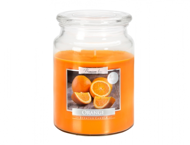 Oranžová svíčka ve skle s vůní pomeranče. Doba hoření: 100 hodin. Hmotnost: 500 g. Šířka: 10 cm, výška: 14 cm.