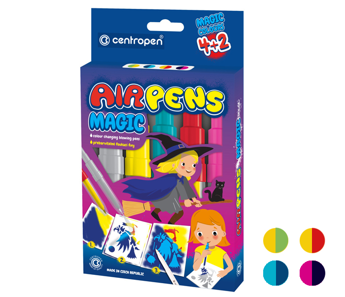 - sada magických foukacích fixů s vnitřní náplní, které jsou určeny na papír- náplně obsahují zdravotně nezávadný inkoust přebarvitelný zmizíkem- ventilační chránítko, po použití řádně uzavřít- balení obsahuje 5 kusů foukacích fixů, 1 klasický zmizík a 8 šablon