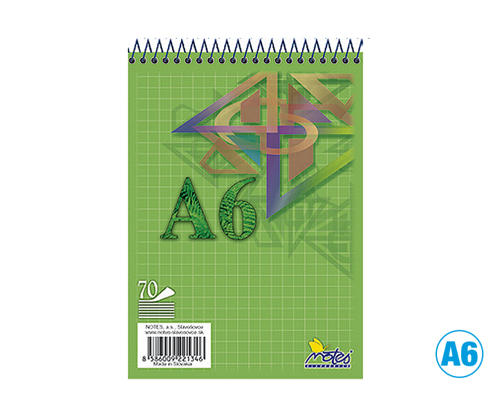 - z bezdřevého papíru- spirála na kratší straně- podlepený šedou lepenkou- formát: A6- počet listů: 70- vzor: čtverečkovaný- gramáž: 60g/m²