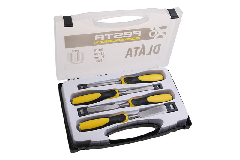 Sada dlátek FESTA 4 ks 6, 12, 19, 25 mm s ergonomickou plastovou rukojetí, úderová plocha. Čepel je kovaná z CrV oceli tvrzená po celé délce.