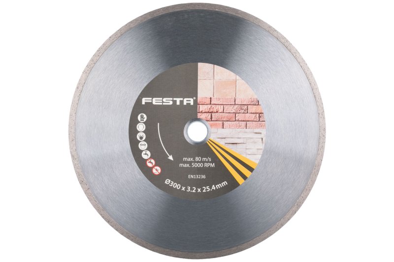 Profesionální diamantový kotouč FESTA, provedení : PLNÝ - celoobvodový, kvalitní diamantová vrstva s vysokým obsahem diamantového prachu, přesné zpracování - napojení na nosný disk kotouče odolávající vysokým teplotám, použití : určený pro mokré i suché řezání dlažby a obkladů, betonu, cihel, zdiva, žuly, mramoru, kamene, skla, keramiky, balení : blistr s eurootvorem, rozměry : uvedeny v názvu výrobku.