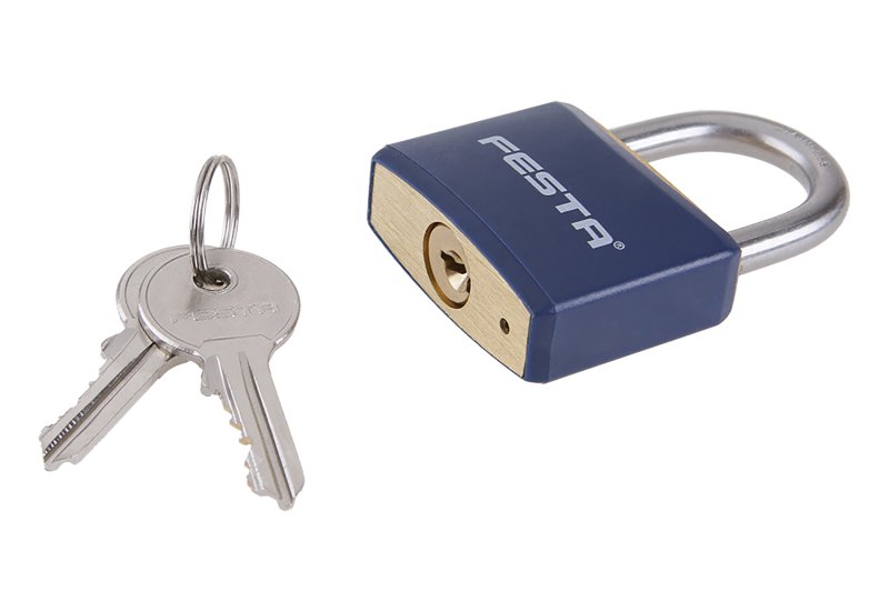 Visací zámek s mosazným tělem a nerezovým obloukem. Mosazné tělo zámku je poplastované. 2 klíče.