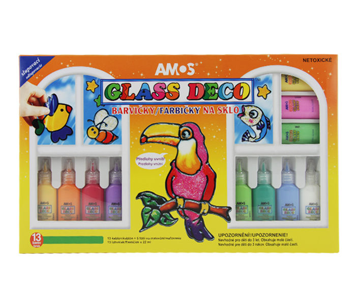 - slupovací barvy na sklo- lze přenést na sklo, zrcadlo nebo jiný hladký podklad- barvy zanechávají skrvny na oblečení- sada 13 barev, včetně třpytivých, šablonky se 13 vzory, 5 fólií- objem tuby 22ml