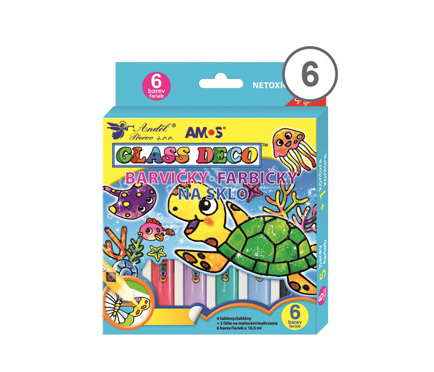 - slupovací barvy na sklo- lze přenést na sklo, zrcadlo nebo jiný hladký podklad- barvy zanechávají skrvny na oblečení- sada 6 barev, 4 šablonky, 2 fólie- objem tuby 10,5ml