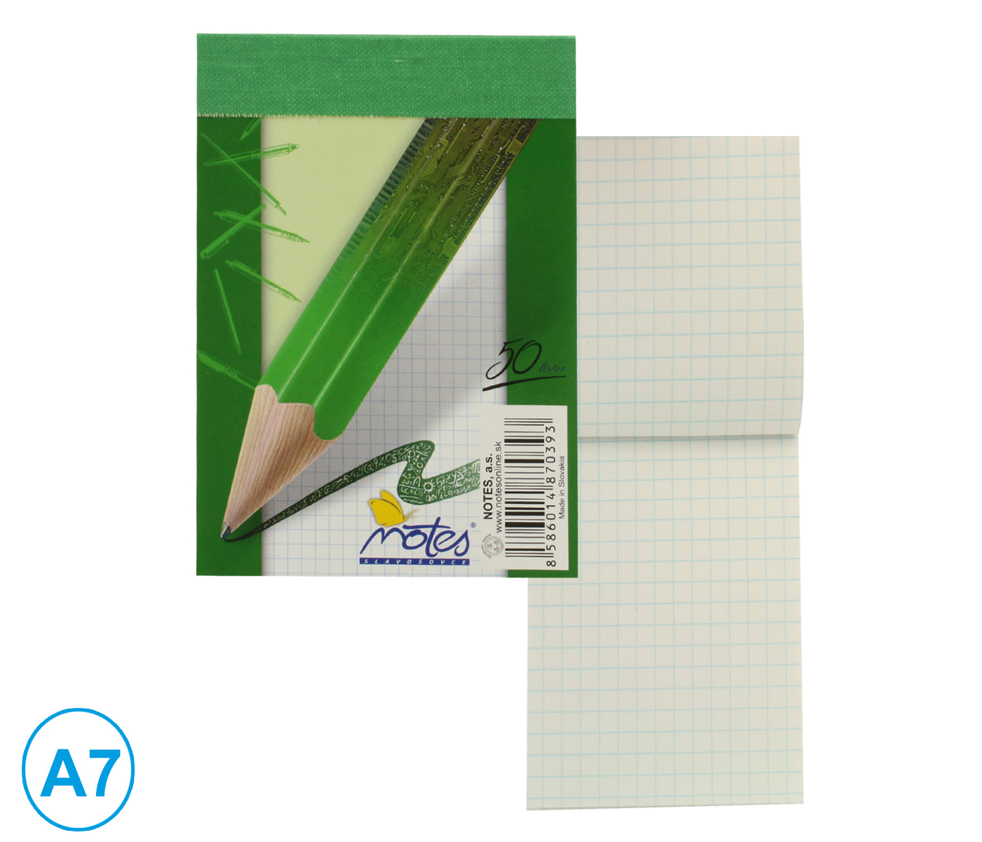 - poznámkový trhací blok- z bezdřevého papíru- šitý na kratší straně- podlepený šedou lepenkou- formát: A7- počet listů: 50- vzor: čtverečkovaný 5x5mm- gramáž: 60g/m²