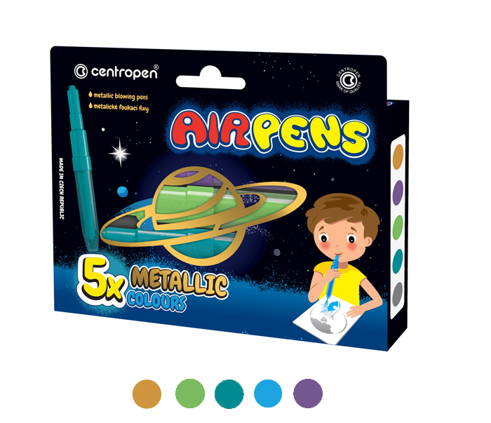 - foukací fixy na bílý i tmavý papír- metalické inkousty- zdravotně nezávadný inkoust- 5 barevných odstínů- 1 šablona (součást obalu)