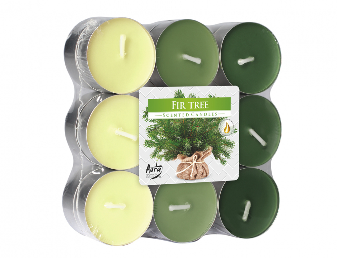 Čajová svíčka vonící po jedli, v hliníkovém kalíšku. Obsahuje esenciální oleje. Má certifikát kvality RAL, který garantuje bezpečnost a kvalitu použitých materiálů. Velikost: průměr 3,9 cm, výška 1,5 cm. Balení: 18 ks (3 řady po 3 kusech, 2 vrstvy) v igelitu s obrázkem. Hmotnost: 18x11g. Doba hoření: cca 4 hodiny. Barva: 3 odstíny zelené.