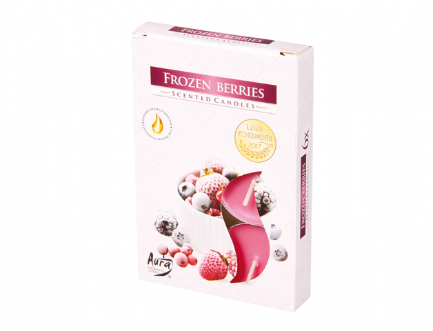 Světle fialové čajové svíčky s vůní mraženého ovoce. Baleno po 6 kusech v papírové krabičce s potiskem. Doba hoření: 4 hod. Průměr 1 svíčky: 3,9 cm, výška: 1,5 cm.