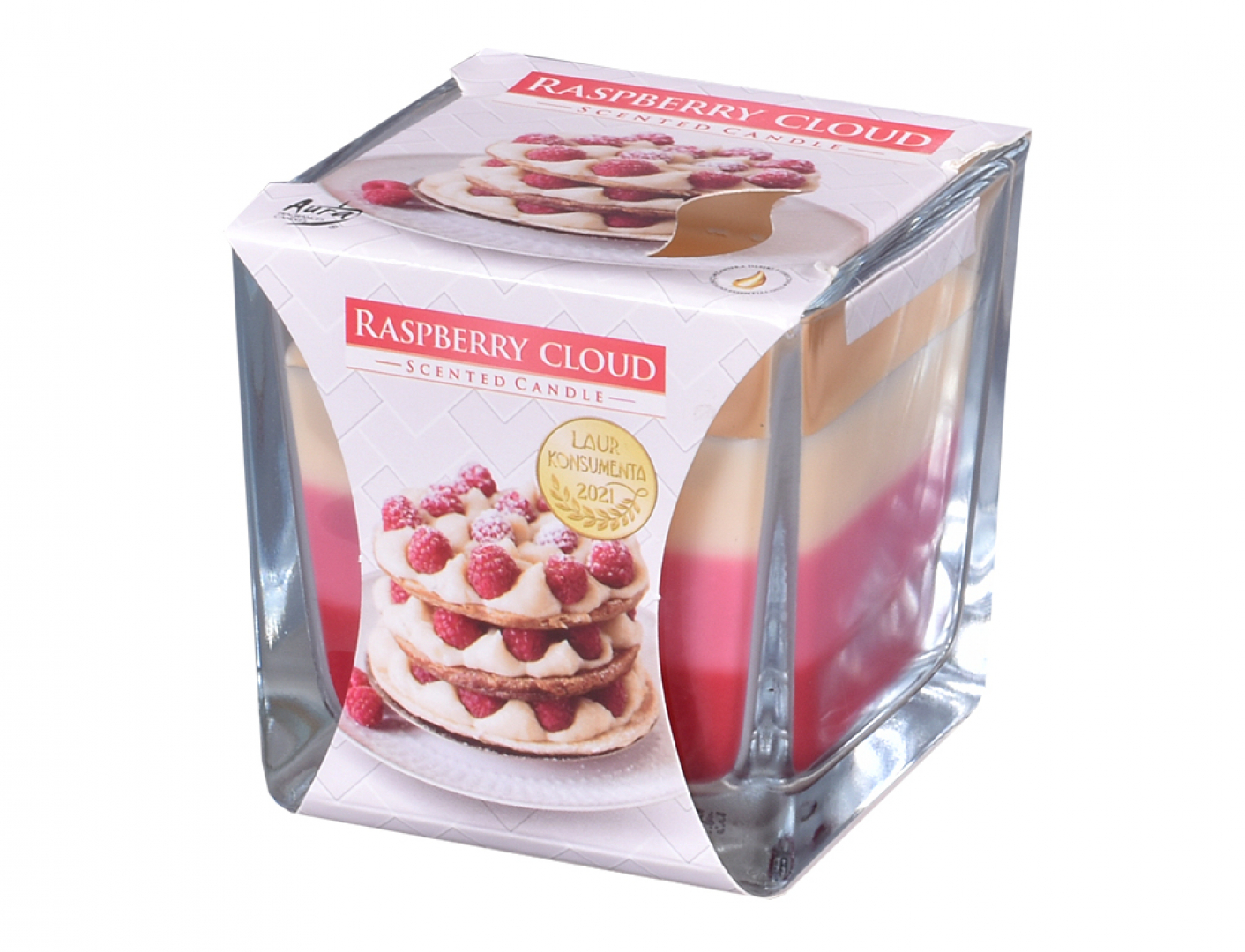 Vonná svíčka v silnostěnném skle se 3 barvami vosku. Má 2 knoty. Voní jako malinový dezert. Doba hoření: 32 hod. Rozměry: 8 x 8 x 8 cm. Hmotnost náplně: 170 g.