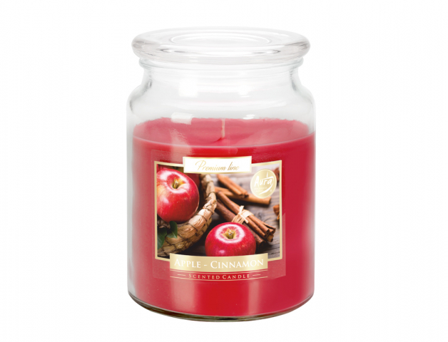 Červená svíčka ve skle s vůní jablka a skořice. Doba hoření: 100 hodin. Hmotnost: 500 g. Šířka: 10 cm, výška: 14 cm.