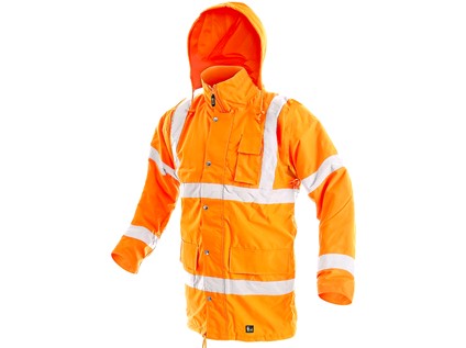 Výstražná bunda s vysokou viditelností, zateplená, odolná proti vodě a větru, kapuce v límci, reflexní pruhy, venkovní kapsa na mobil, možnost utažení v dolní části bundy.