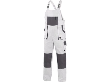 Pánské montérkové kalhoty s náprsenkou, náprsní kapsa na zip, pas vzadu do gumy, přední kapsy, boční kapsa na svinovací / skládací metr, boční kapsa na mobil / peněženku, zdvojená kolena, zadní kapsa s klopou, šle s gumou vzadu, reflexní doplňky. Do