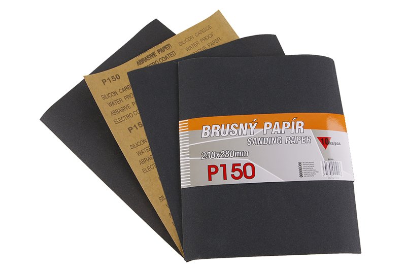 Smirkový papír voděodolný - sada 10 kusů, zrnitost: 150, druh zrna: karbid křemíku, pojivo: syntetická pryskyřice voděvzdorná, podkladový materiál : pružný vodovzdorný papír C (110-135g/m2), rozměry : uvedeny v názvu výrobku, balení : 10 kusů - papírový návlek.