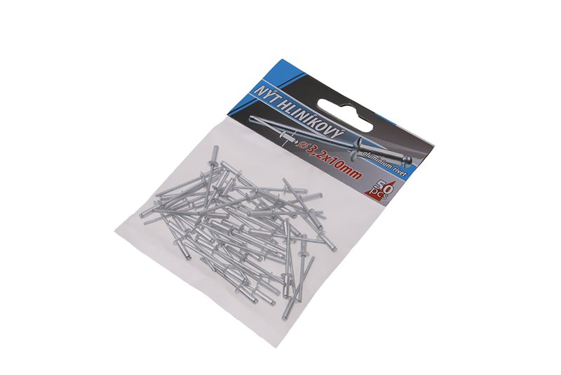 Klasické trhací slepé aluminiové nýty průměr 3,2 mm délka 10 mm v malém balení 50 kusů, vhodné pro malospotřebitele. Instruktážní video Instruktážní video