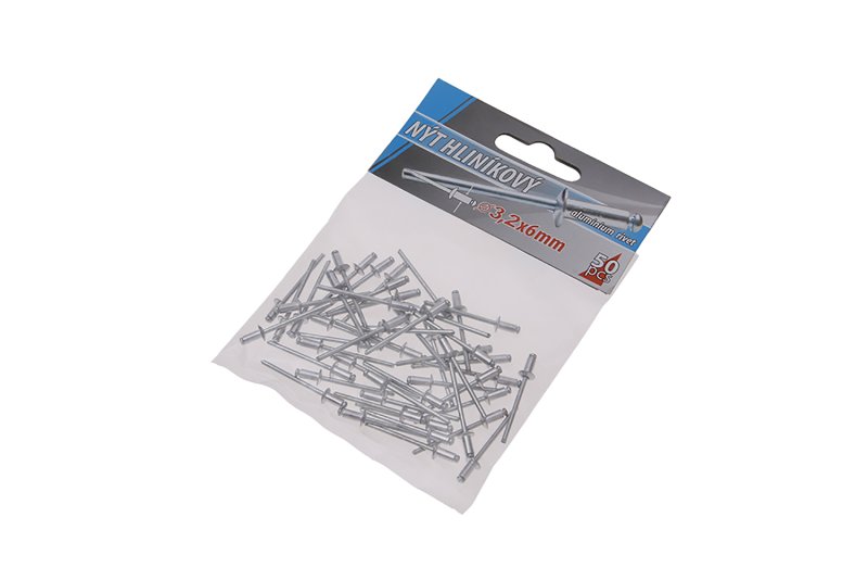 Klasické trhací slepé aluminiové nýty průměr 3,2 mm délka 6 mm v malém balení 50 kusů, vhodné pro malospotřebitele. Instruktážní video Instruktážní video