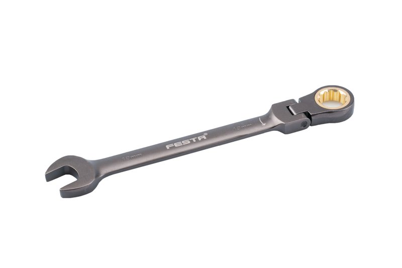 Ráčnové klíče FESTA s kloubem pro použití pod úhlem s výhodou rohatky (ráčny) jsou vyrobeny kováním z kvalitní chromvanadiové oceli. Tato ocel povrchově upravená matným tvrdochromem pro dosažení optimální povrchové tvrdosti a odolnosti vůči korozivním vlivům. Rohatku ráčny klíče tvoří 72 kalených zubů, záběr po 5-ti obloukových stupních. Kvalitou, tvrdostí a přesností přesně odpovídají normě DIN/ISO.