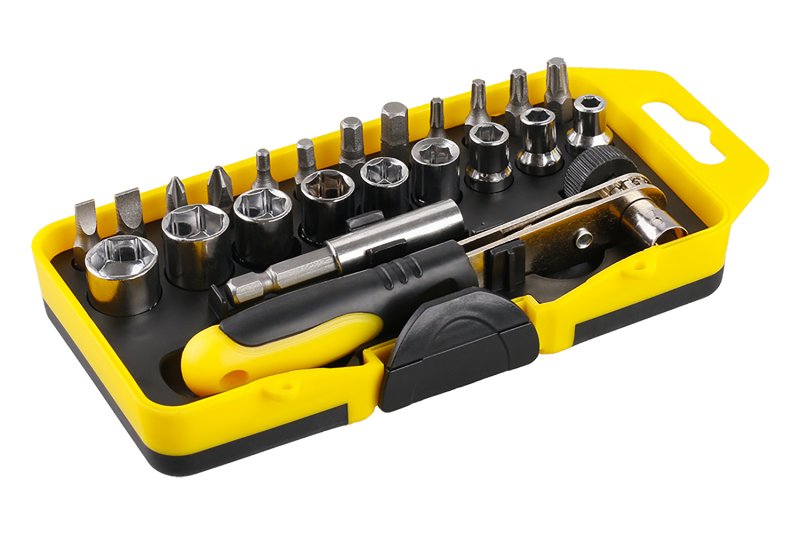 sada adapterů a bitů s oboustrannou ráčnou na bit 1/4", nebo adapter 1/4" chromvanadiová ocel, plastový přehledný box osazení sady - viz obrázek