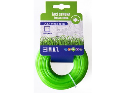 délka: 15 m profil čtverec: 2,4 mm materiál nylon barva: zelená Univerzální náhradní struna do do všech druhů vyžínačů.