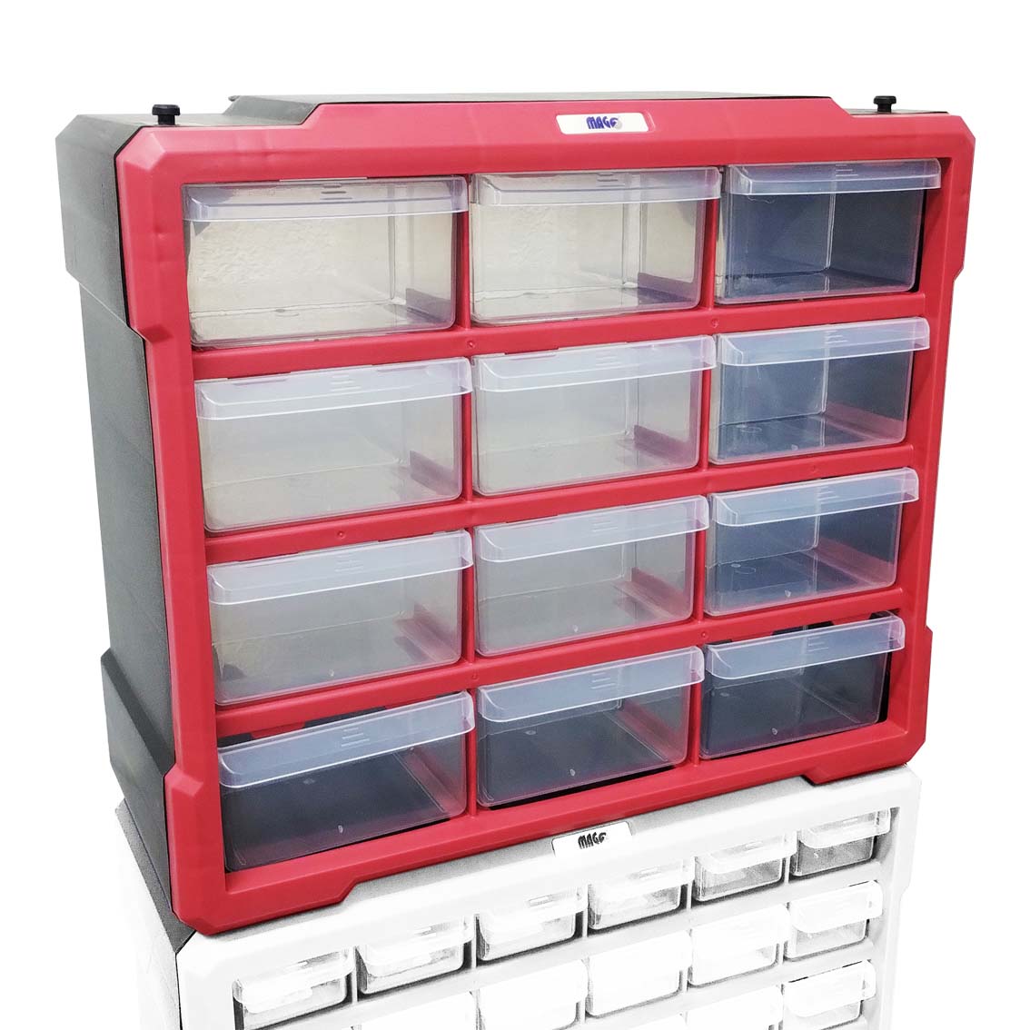 Plastová skříňka s 12 šuplíky je nezbytnou úložnou možností pro vaši dílnu. Je ideální pro uložení drobných předmětů, jako jsou vrtáky, šrouby, hřebíky, matice, podložky, kleště, šroubováky a mnoho dalšího. Skříňka je vyrobena z odolného plastu. Díky průhledným zásuvkám budete mít vždy přehled o uložených předmětech.