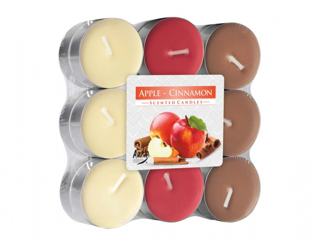 Čajové svíčky ve třech odstínech s vůní jablka a skořice v hliníkovém kalíšku. Baleno po 18 kusech (3 řady po 3 kusech, 2 vrstvy) v igelitu s obrázkem jablek a skořice.