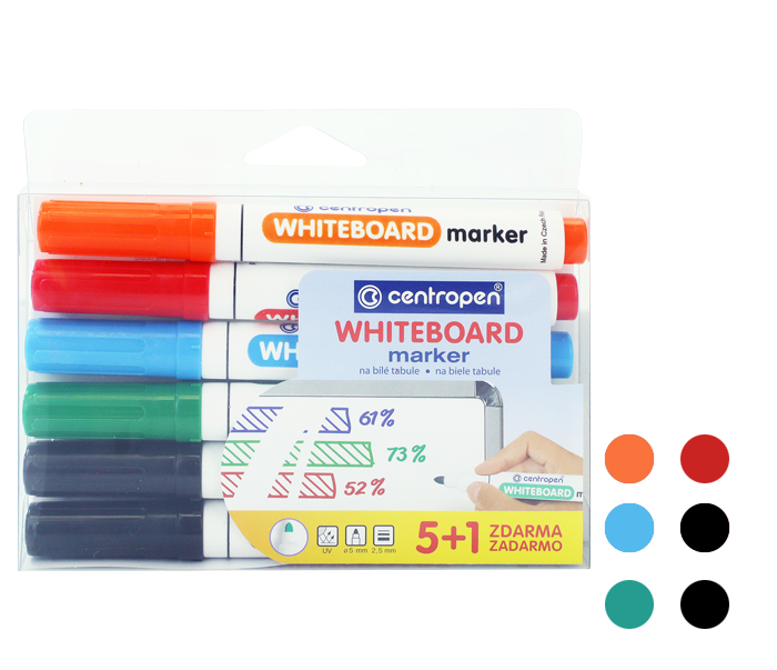 - značkovač na bílé smaltované tabule a na neporézní povrchy- za sucha stíratelný- světlostálý- alkoholová báze- skladovat ve vodorovné poloze- 6 barev v balení- válcový hrot- šířka stopy 2,5 mm