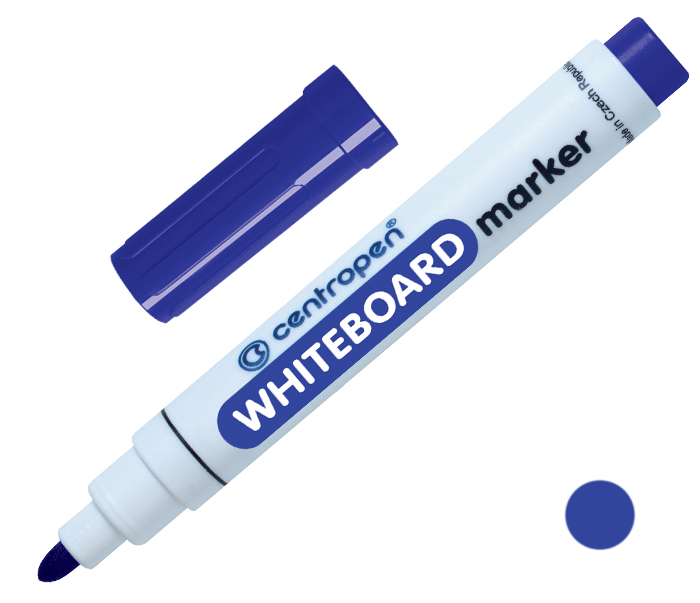 - značkovač na bílé smaltované tabule a na neporézní povrchy- zdravotně nezávadný, za sucha stíratelný, světlostálý inkoust na alkoholové bázi- vhodný i na dřevo, film, fólie, kov, papír, sklo, porcelán- skladovat ve vodorovné poloze, případně hrotem dolů- ventilační chránítko, po použití uzavřít- barva modrá- šířka stopy 2,5mm- válcový hrot