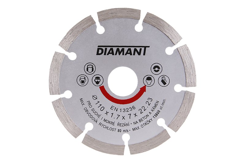 Diamantový kotouč DIAMANT, provedení : SEGMENTOVÝ, kvalitní materiály i zpracování - vysoce pevné uchycení diamantových segmentů k nosnému disku kotouče, vysoký obsah diamantového prachu v segmentech, použití : pro suché řezání betonu, cihel, zdiva, kamene, ... , balení : blistr s eurootvorem, přiložen redukční kroužek z 22,2 na 20 mm, rozměry: uvedeny v názvu výrobku. Instruktážní video