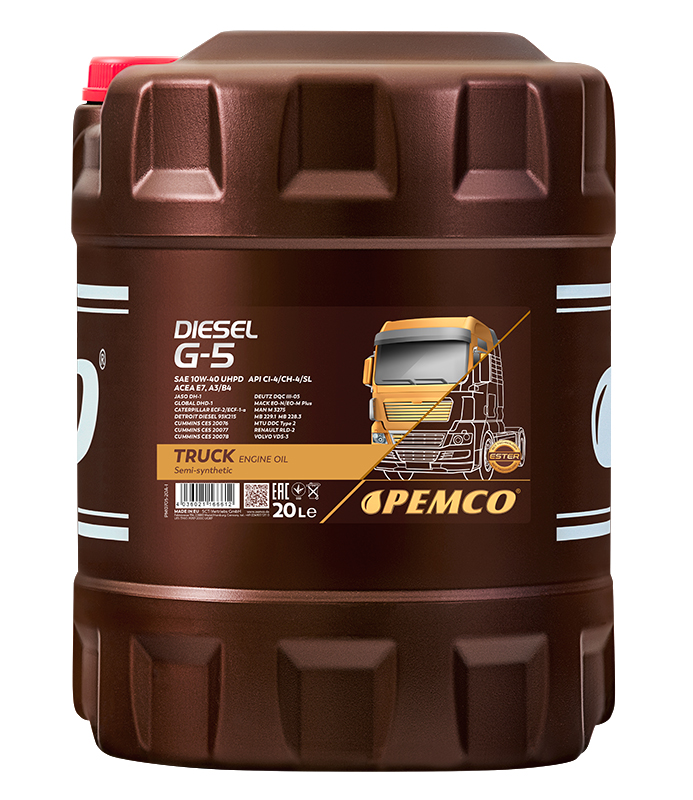 PEMCO Diesel G-5 UHPD E7 je polosyntetický (UHPD) motorový olej, který splňuje nejpřísnější normy výrobců nákladních automobilů. Bezpečně chrání součástí motoru před opotřebením buď při studeném startu, nebo při vysokých teplotách. Určeno pro všechny typy těžkých dieselových motorů (dálkové nákladní vozy, autobusy atd.), terénní stroje (stavební, důlní, zemědělské) a speciální techniku evropských, amerických a asijských výrobců splňující požadavky Euro I, II , III, IV, kde je požadována výkonnostní třída CI-4 nebo nižší.