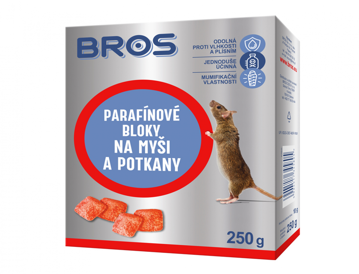 Voskové bločky na myši a potkany jsou mimořádně odolné vůči vodě a plísním. Jsou vhodné i pro použití v prostředí s vysokou vlhkostí, například ve sklepích či na otevřeném prostranství. Obsahuje látku, která brání náhodnému požití lidmi a domácími zvířaty. Účinná látka je bromadiolon - 0,0029 %. Dávkování: myš - 60 g na každých 5-10 m, potkan - 100 g na každých 5 - 10 m. Návod k použití: umístěte do nástrahových stanic, které jsou zajištěny proti náhodnému otevření a na místech, kde se vyskytují hlodavci. Balení: 250 g.